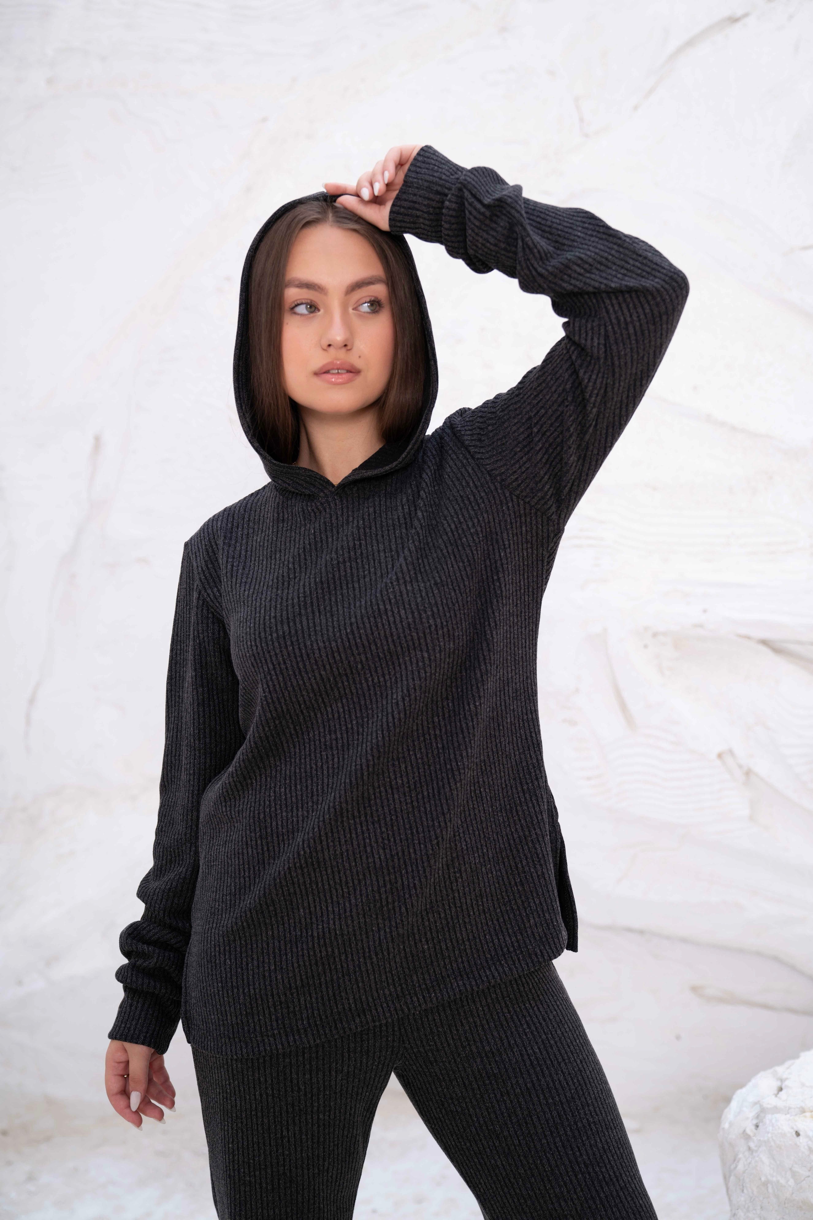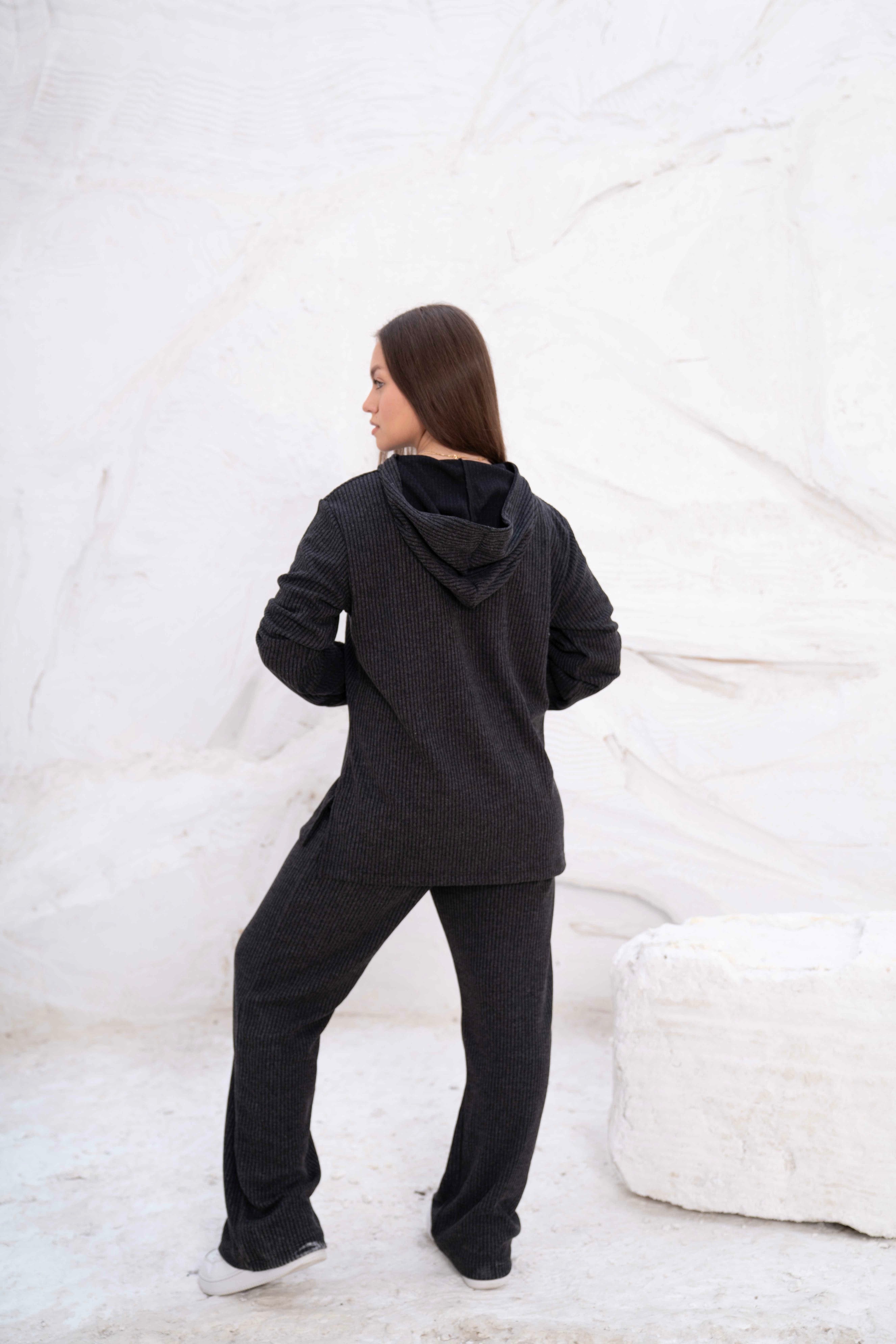 This lounge set is perfect for women searching for "Turkish rib loungewear in Egypt", "black two-piece outfits for women", or "cozy hooded lounge sets for women."