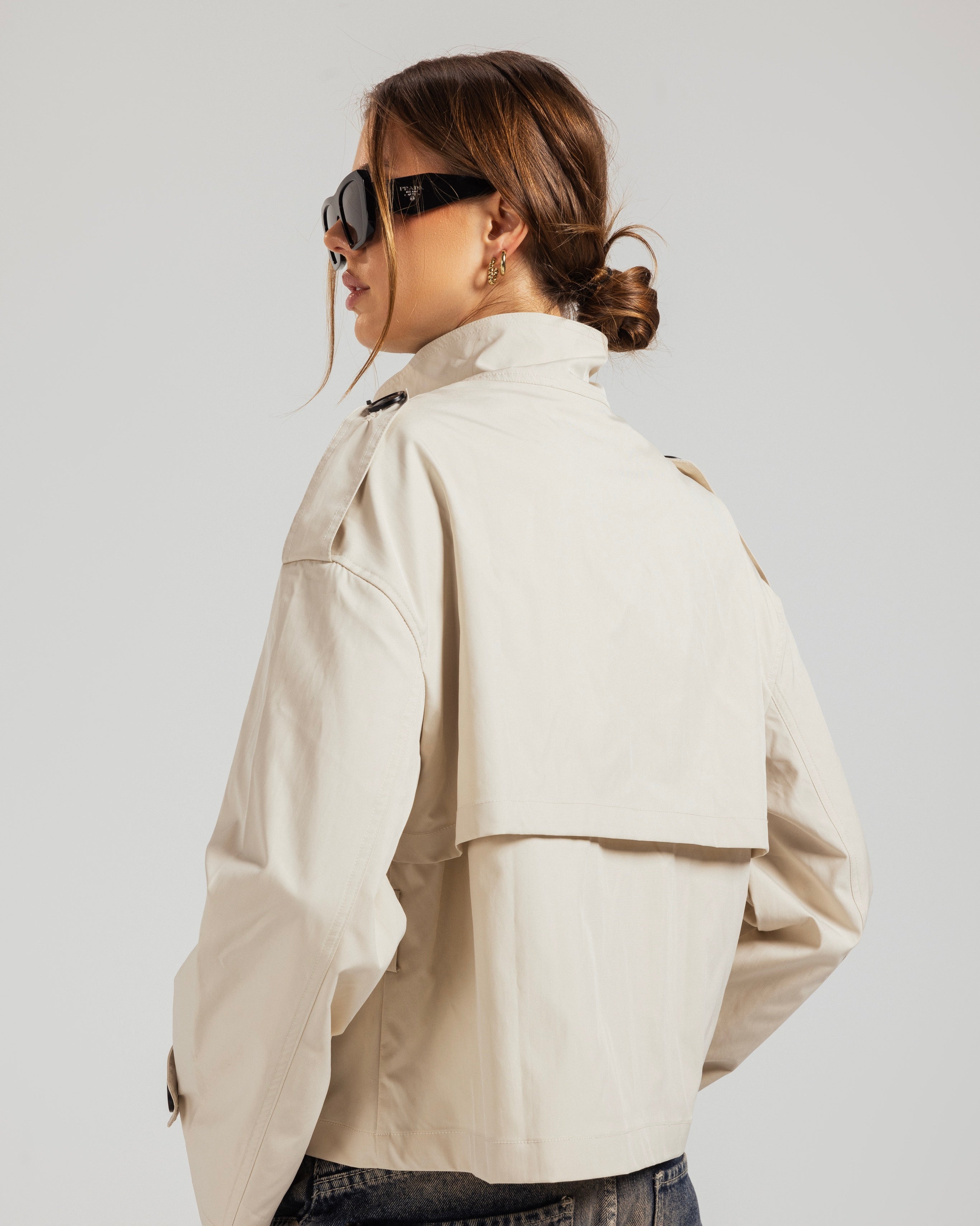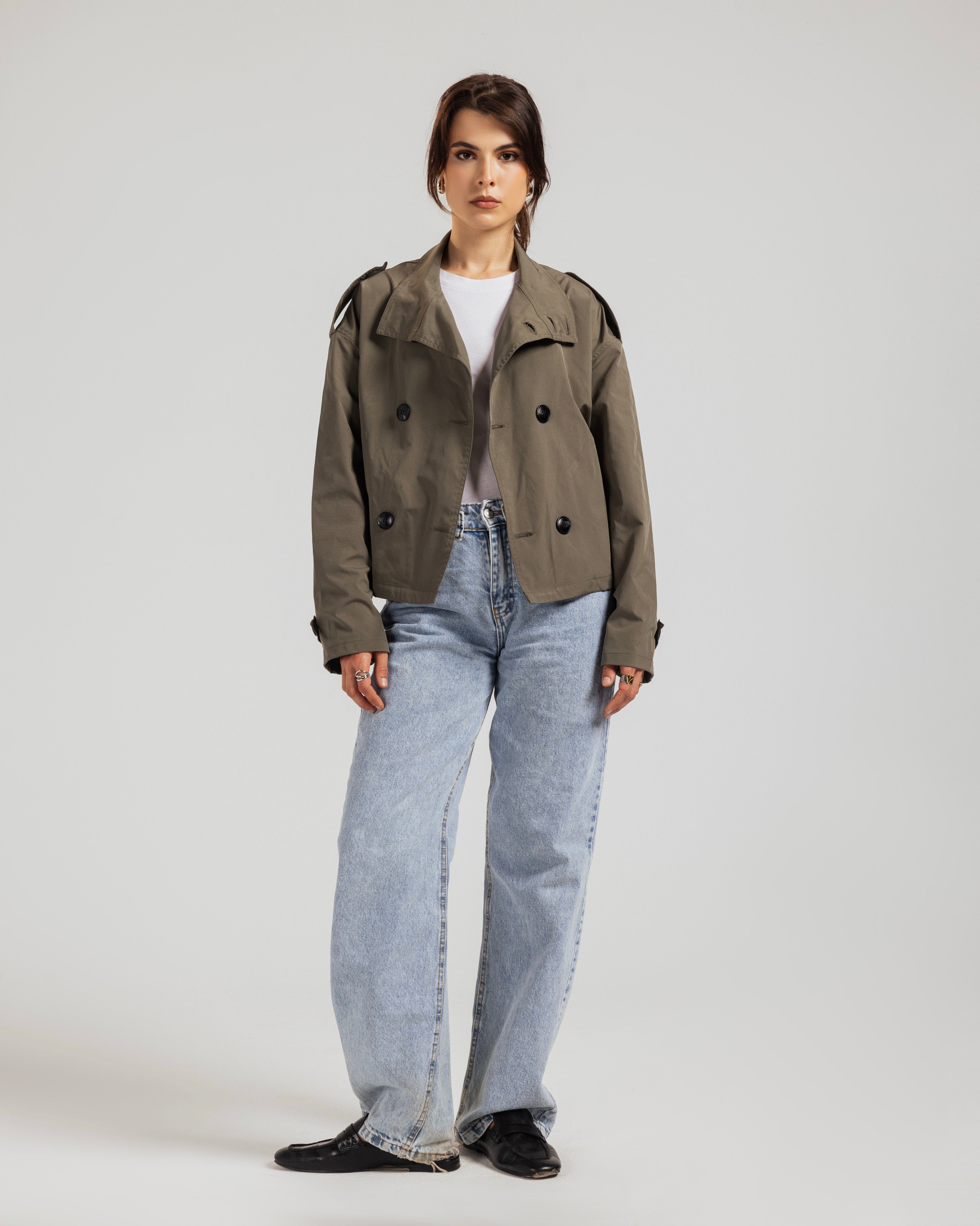 Designed with a distinctive high funnel neck and classic double-breasted button closure with bold black buttons, this jacket exudes confidence and sophistication. The cropped 55 cm length creates a flattering silhouette that pairs beautifully with high-waisted bottoms, while the structured shoulders and tailored fit deliver a polished, put-together appearance. Epaulette shoulder details and flap chest pockets add authentic military-inspired charm to this contemporary design.