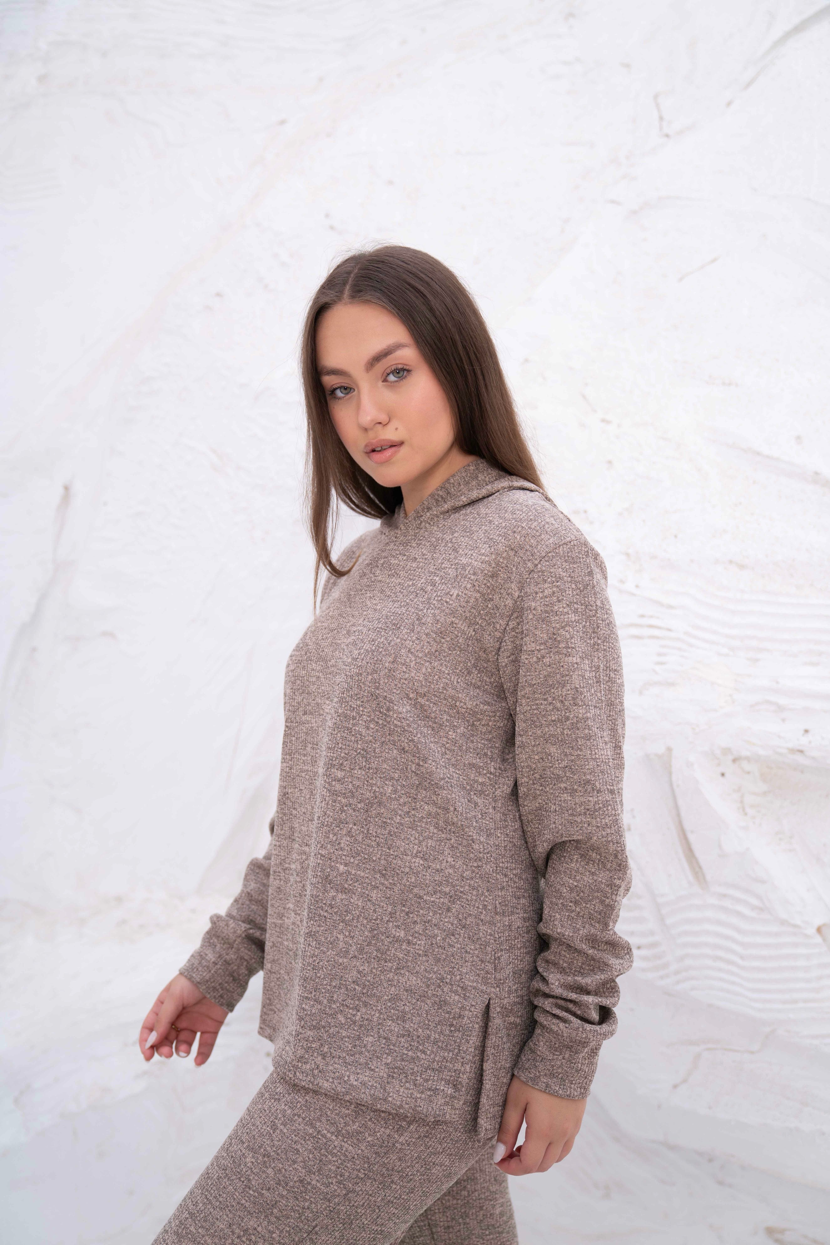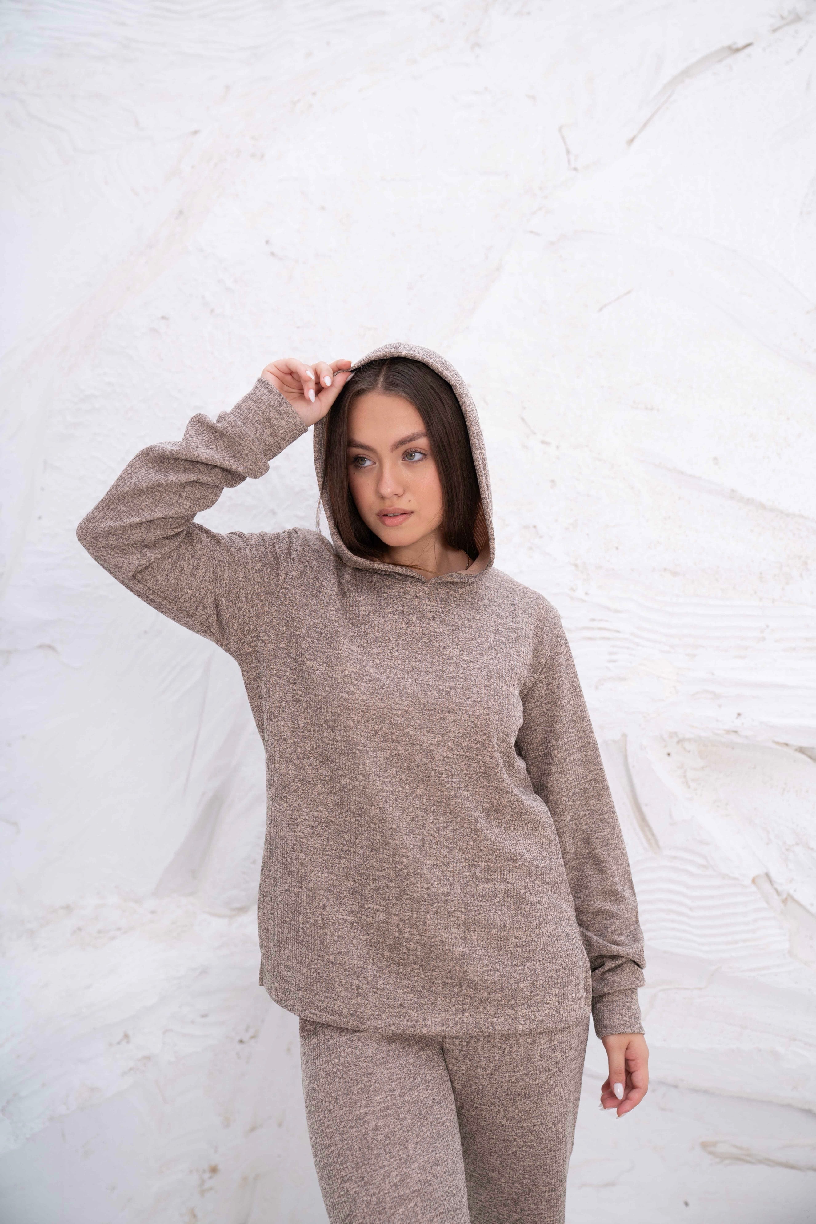 This lounge set is perfect for women searching for "Turkish rib loungewear in Egypt", "mocha brown two-piece outfits for women", or "cozy hooded lounge sets for women."