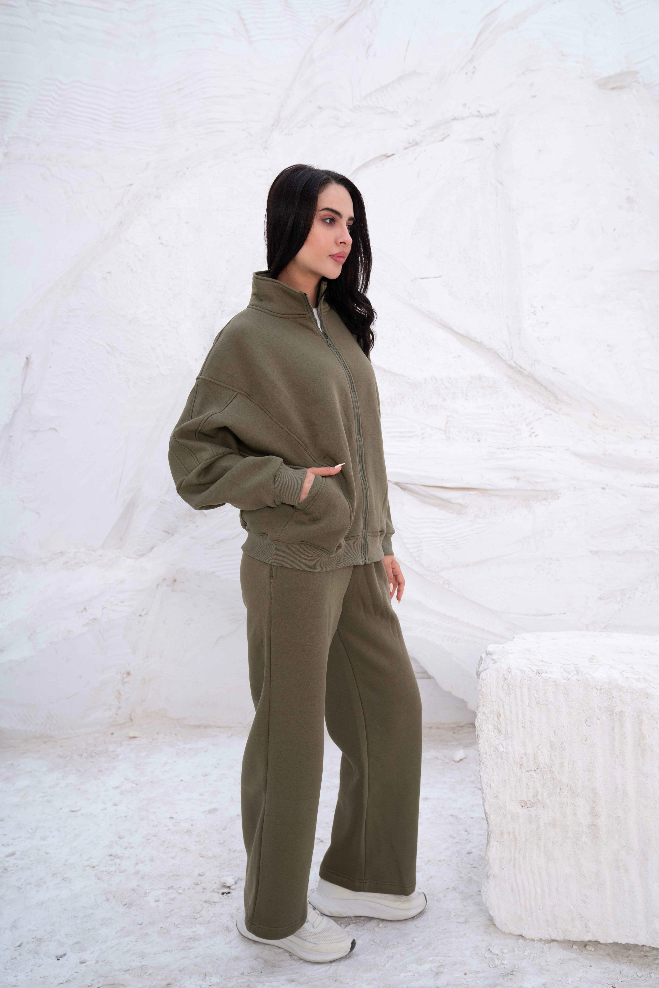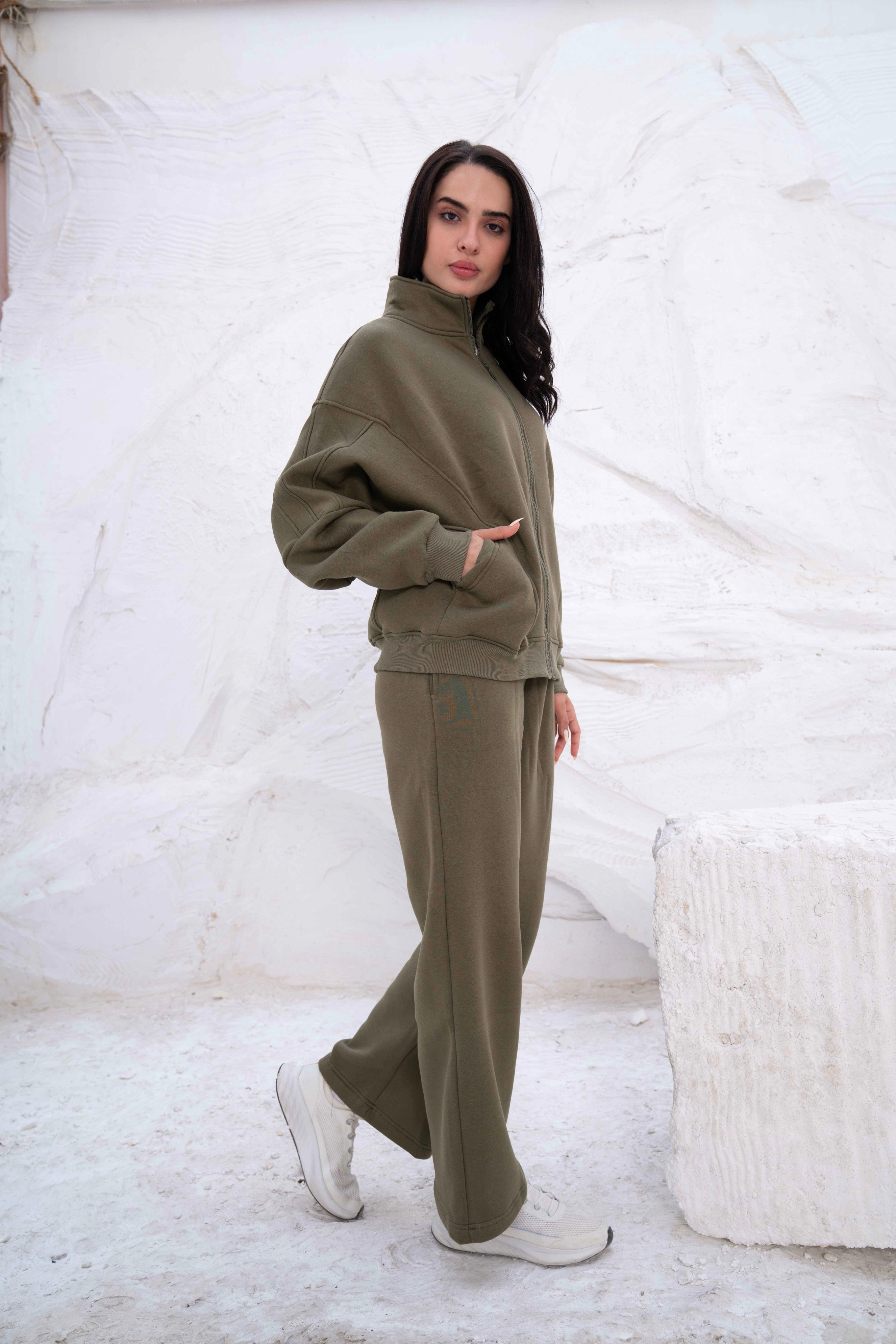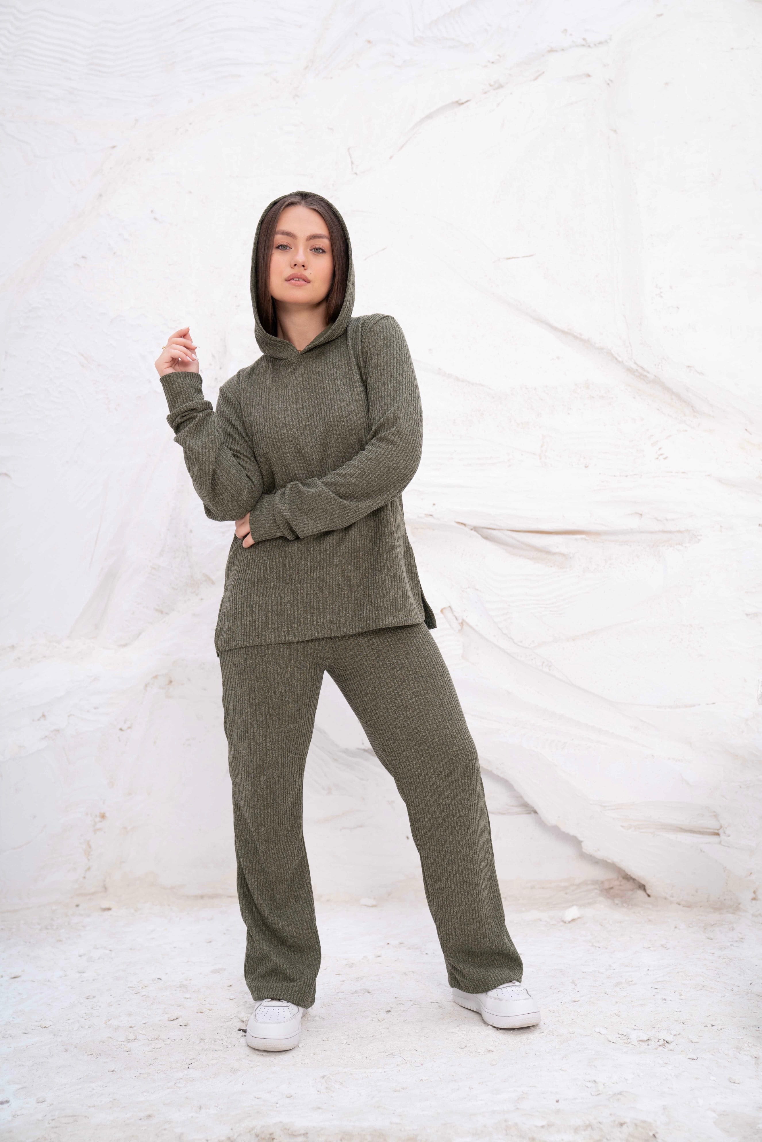 Olive Green Rib Hooded Lounge Set