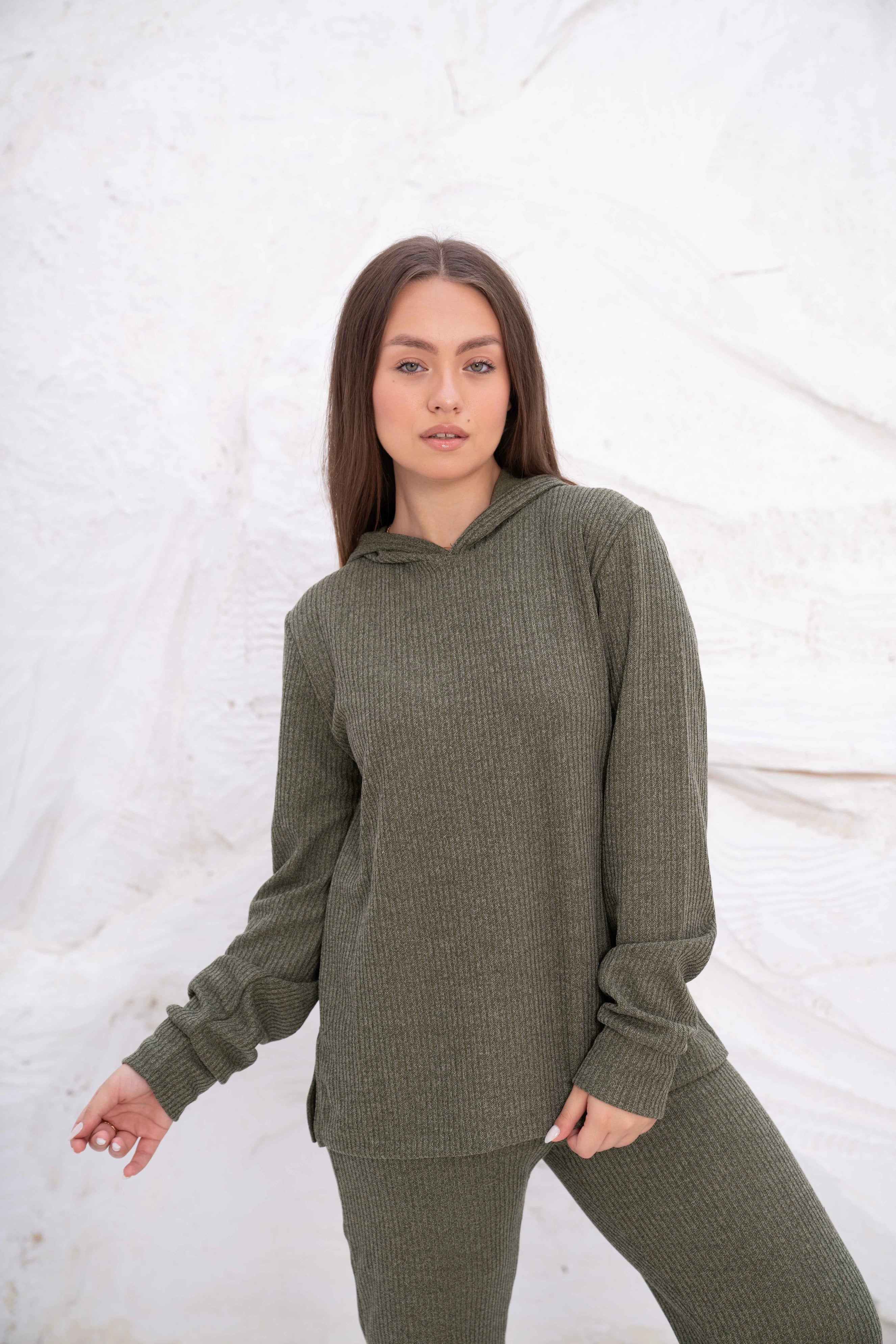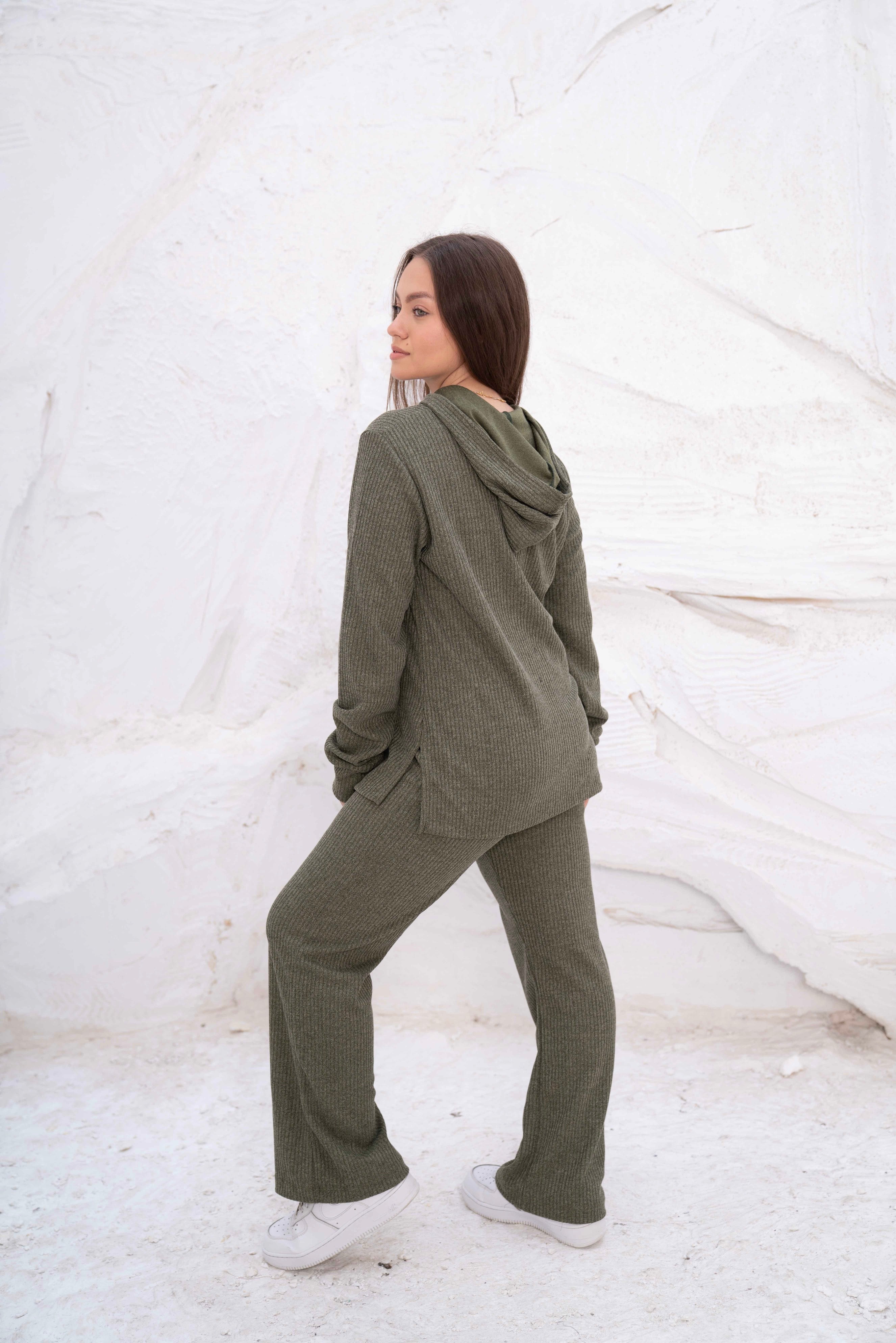 This lounge set is perfect for women searching for "Turkish rib loungewear in Egypt", "olive green two-piece outfits for women", or "cozy hooded lounge sets for women."