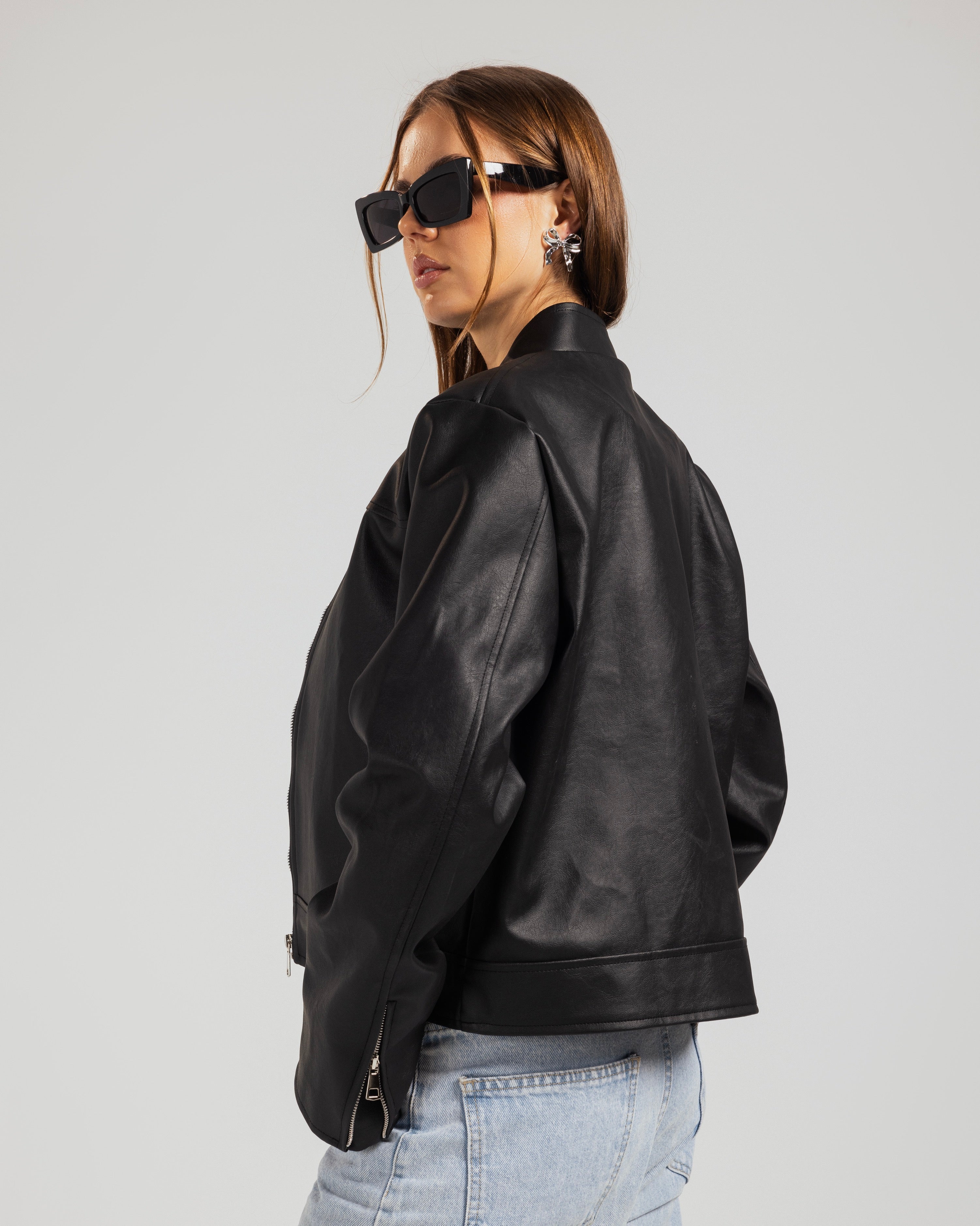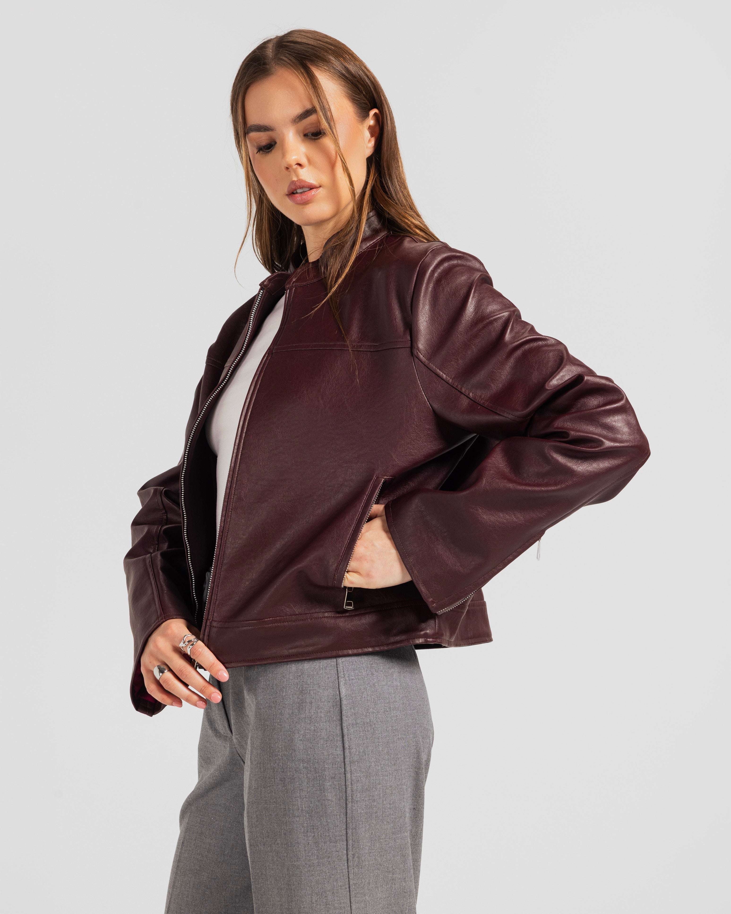 Crafted from premium quality faux leather with a soft, supple finish, this bomber jacket features all the iconic details that define the style: ribbed collar, cuffs, and hem for authentic bomber aesthetic, plus a smooth front zip closure for sleek sophistication. At 55 cm in length, the cropped cut hits perfectly at the waist, creating a flattering silhouette that pairs beautifully with high-waisted bottoms and defines your proportions.