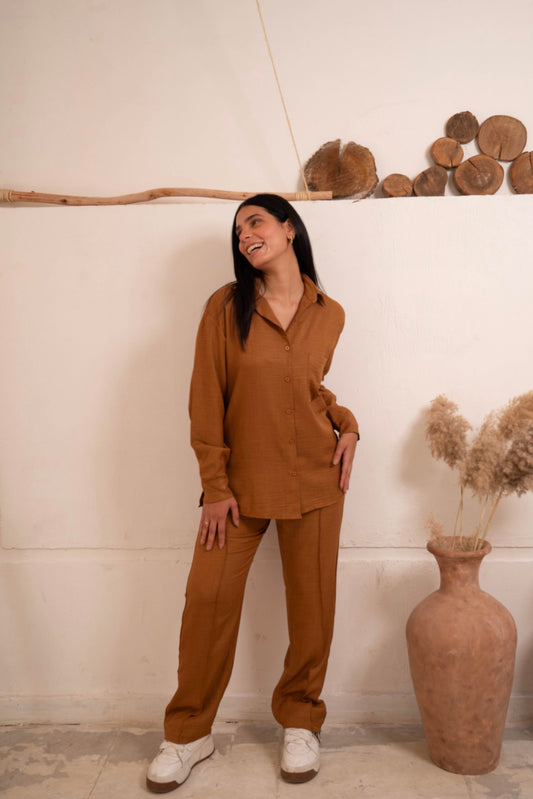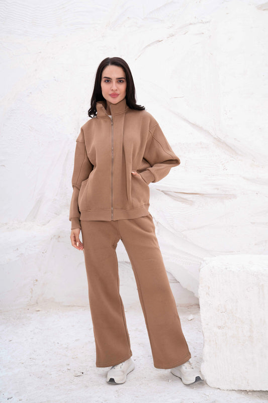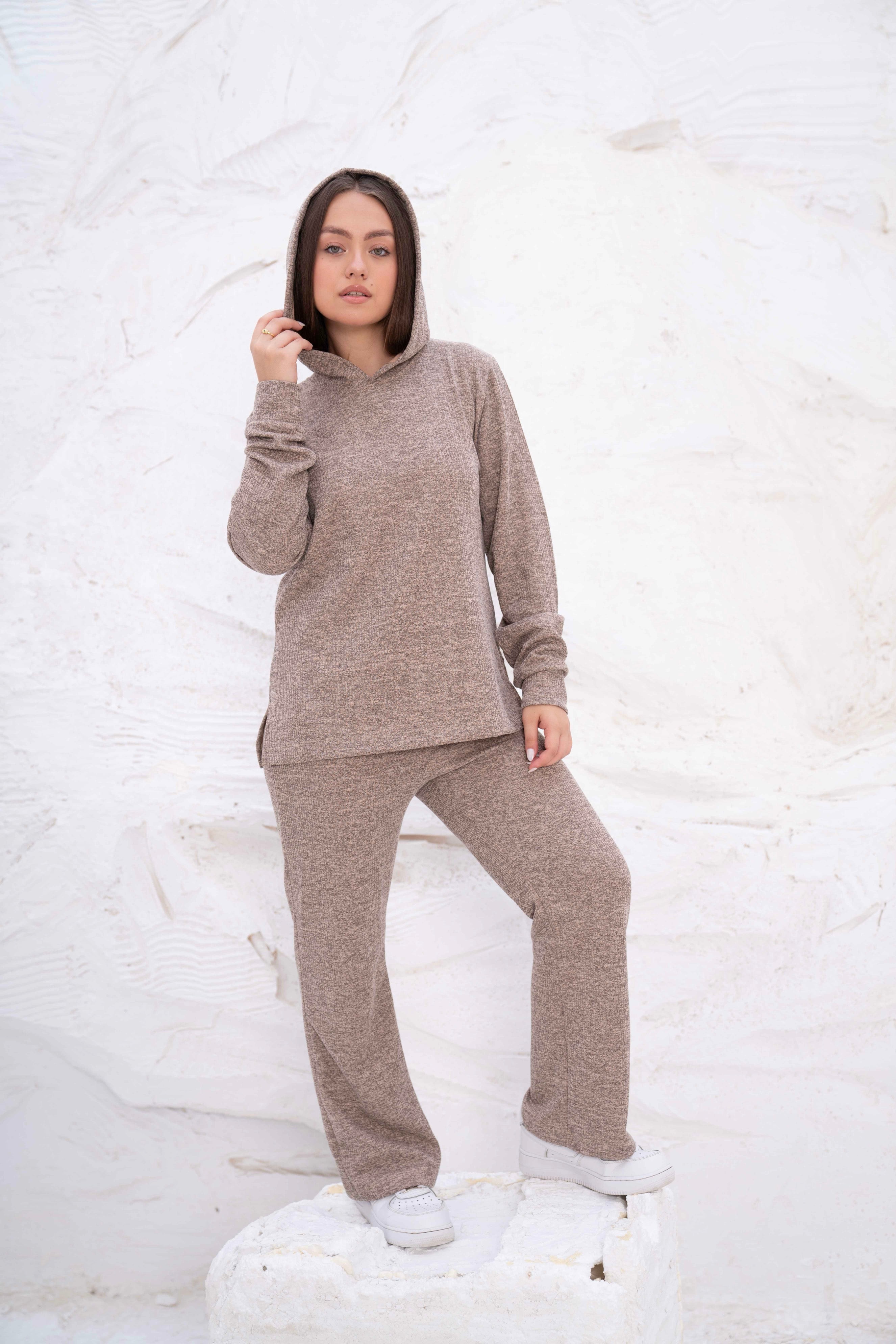 This lounge set is perfect for women searching for "Turkish rib loungewear in Egypt", "mocha brown two-piece outfits for women", or "cozy hooded lounge sets for women."